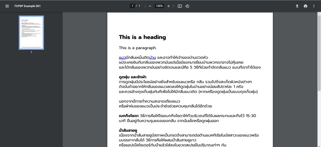 คำสั่ง WriteHTML เป็นคำสั่งที่อนุญาติให้เราจัดเอกสาร PDF ได้ด้วยคำสั่ง HTML ซึ่งสามารถที่จะใส่แท็กอะไรเข้าไปก็ได้ อย่างถ้าเราใส่แท็ก a เข้าไป สิ่งที่พิมพ์ออกมาในไฟล์ PDF ก็จะเป็นลิ้งก์ หรือถ้าหากเราใส่แท็ก h1 เข้ามา มันก็จะแสดงออกมาเป็นตัวอักษรตัวหนาและใหญ่
